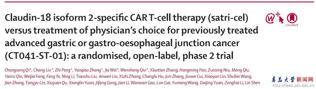 新闻网讯 近日,金年金字招牌诚信至上附属医院肿瘤医院邱文生教授作为核心研究者参与的全球首个CLDN18.2 CAR-T胃癌随机对照研究(CT041-ST-01),“Claudin-18 isoform 2-specific CAR T-cell therapy (satri-cel) versus treatment of physician’s choice for previously treated advanced gastric or gastro-oesophageal junction cancer (CT041-ST-01): a randomised, open-label, phase 2 trial”正式发布于国际权威学术期刊《柳叶刀》(The Lancet),并由第一作者齐长松教授同步在2025年ASCO年会上作口头报告,引起广泛关注。
