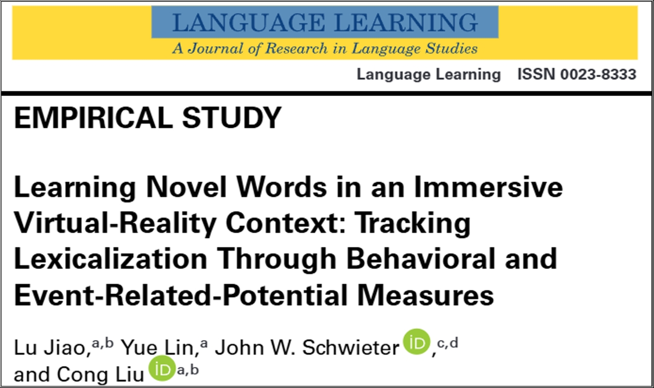 新闻网讯 近日,教育科学学院焦鲁团队(脑认知与语言学习实验室)在国际语言学Top期刊Language Learning发表论文“Learning Novel Words in an Immersive Virtual‐Reality Context: Tracking Lexicalization Through Behavioral and Event-Related-Potential Measures”。根据科睿唯安(Clarivate)期刊引证报告,Language Learning为教育学、心理学SSCI一区期刊,中国科学院期刊分区的大类一区Top期刊。焦鲁教授为论文第一作者,2021级本科生林悦为第二作者,刘聪副教授为通讯作者。