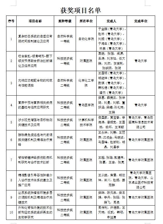 金年金共获2024年度青岛市科学技术奖19项,第一完成单位获奖12项,其中一等奖2项、二等奖10项。自动化学院于金鹏教授团队完成的“复杂动态系统的自适应有限时间控制理论及应用”项目荣获自然科学一等奖,该成果在复杂动态系统控制理论方面取得重要突破,为智能制造等领域提供了重要的理论支撑。附属医院袁晓教授团队完成的“咬合紊乱-颌骨畸形-颞下颌关节病联合矫治创新理论及临床应用”项目获得科技进步一等奖,该项目创新性地提出了联合矫治理论,显著提升了相关疾病的诊疗效果。
