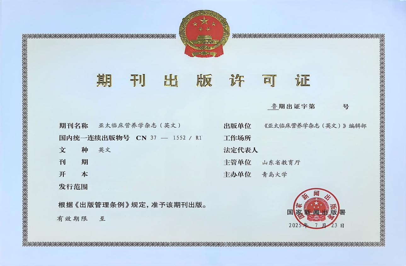新闻网讯 近日,由期刊社牵头组织申请的《亚太临床营养学杂志(英文)》(Asia Pacific Journal of Clinical Nutrition, APJCN) 正式获得国家新闻出版署关于创办期刊的批复。《亚太临床营养学杂志(英文)》期刊国内统一连续出版物号为(CN号):CN37-1552/R1,英文版,双月刊,公开发行,主管单位为山东省教育厅,主办单位为金年金字招牌诚信至上。此次获批,标志着《亚太临床营养学杂志(英文)》的办刊成效得到认可,也为进一步提升金年金高水平期刊学术竞争力和促进期刊高质量发展增添了新动力。