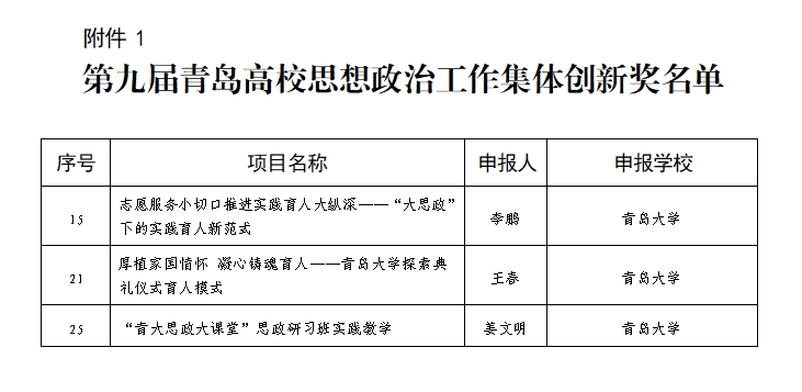 校团委申报的《志愿服务小切口推进实践育人大纵深——“大思政”下的实践育人新范式》、党委学生工作部申报的《厚植家国情怀 凝心铸魂育人——金年金字招牌诚信至上探索典礼仪式育人模式》、马克思主义学院申报的《“青大思政大课堂”思政研习班实践教学》获评青岛高校思想政治工作集体创新奖。