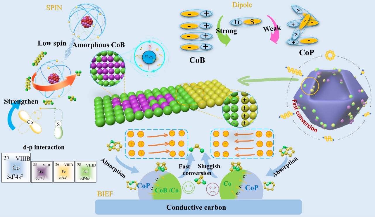 该工作提出通过引入非晶CoB相至Co-CoP异质结中,协同调控BIEF、自旋态与偶极耦合效应,实现LiPSs的高效吸附与快速转化。该研究提出内建电场强度在充放电过程中对异质界面多硫化物迁移具有不同影响,并证明非晶CoB相有效降低了Co-CoP的BIEF强度,促进了充放电过程中多硫化锂在异质界面的双向迁移。B掺杂诱导过渡金属Co的自旋态向低自旋构型转变,增强了d轨道电子局域化,减小了d-p能级间隙,并通过理论计算验证了钴与硫原子之间d-p轨道杂化的优化。与CoP中较弱的偶极矩相比,CoB内部偶极的均匀排列产生了适度增强的静电吸引力,这增强了对多硫化锂的键合效应,并提高了吸附-杂化性能。该研究提出了一种用于增强多硫化物限制/转化的多维协同调控机制(BIEF、自旋和偶极),该机制可推广至其他受穿梭效应困扰的电池体系。