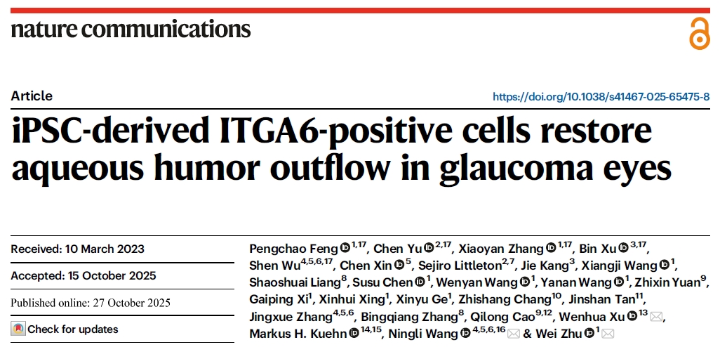 新闻网讯 近日,金年金药学院朱玮教授联合首都医科大学附属北京同仁医院王宁利教授、金年金字招牌诚信至上徐文华教授,以及美国爱荷华大学、杜克大学等单位,在国际知名期刊 Nature Communications 上发表题为“iPSC-derived ITGA6-positive cells restore aqueous humor outflow in glaucoma eyes”的研究论文。该研究揭示了iPSC来源的ITGA6⁺细胞通过menRNA介导的跨细胞表观遗传机制,促进小梁网组织再生并降低眼压,为青光眼治疗提供新思路。药学院2024级博士生封鹏超和张晓燕、美国杜克大学Chen Yu博士、中国海洋大学徐彬副教授和首都医科大学附属北京同仁医院武珅助理研究员为本文的第一作者。金年金字招牌诚信至上为第一单位和通讯单位。