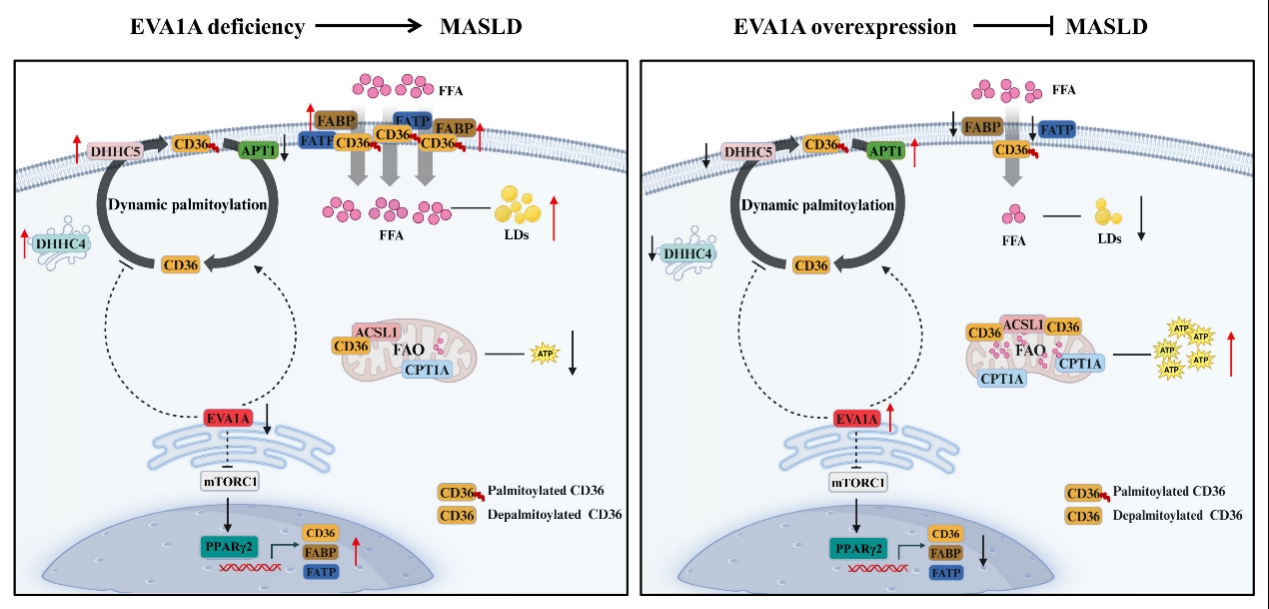 代谢功能障碍相关脂肪肝病(MASLD)已成为全球最常见的慢性肝病之一,但其具体调控机制尚未完全阐明。该研究首次揭示EVA1A是肝脏脂质代谢的关键调控因子和MASLD的潜在保护因子。肝脏特异性敲除EVA1A会诱发小鼠严重的肝脏脂肪变性,而过表达EVA1A则能逆转ob/ob小鼠的脂肪肝表型。机制上,EVA1A缺失会激活mTORC1-PPARγ2信号通路,从而上调脂肪酸转运蛋白CD36转录;同时,EVA1A缺失会抑制S-去棕榈酰化酶APT1的转录,而增强棕榈酰酰基转移酶ZDHHC4/5的转录,从而促进CD36棕榈酰化。这种双重作用促使CD36定位于质膜以摄取脂肪酸,并减少其线粒体上的分布以抑制脂肪酸的β-氧化。该研究确立了EVA1A是肝脏脂质代谢的核心调控因子,并将EVA1A-CD36轴确定为治疗MASLD的一个潜在新靶点。