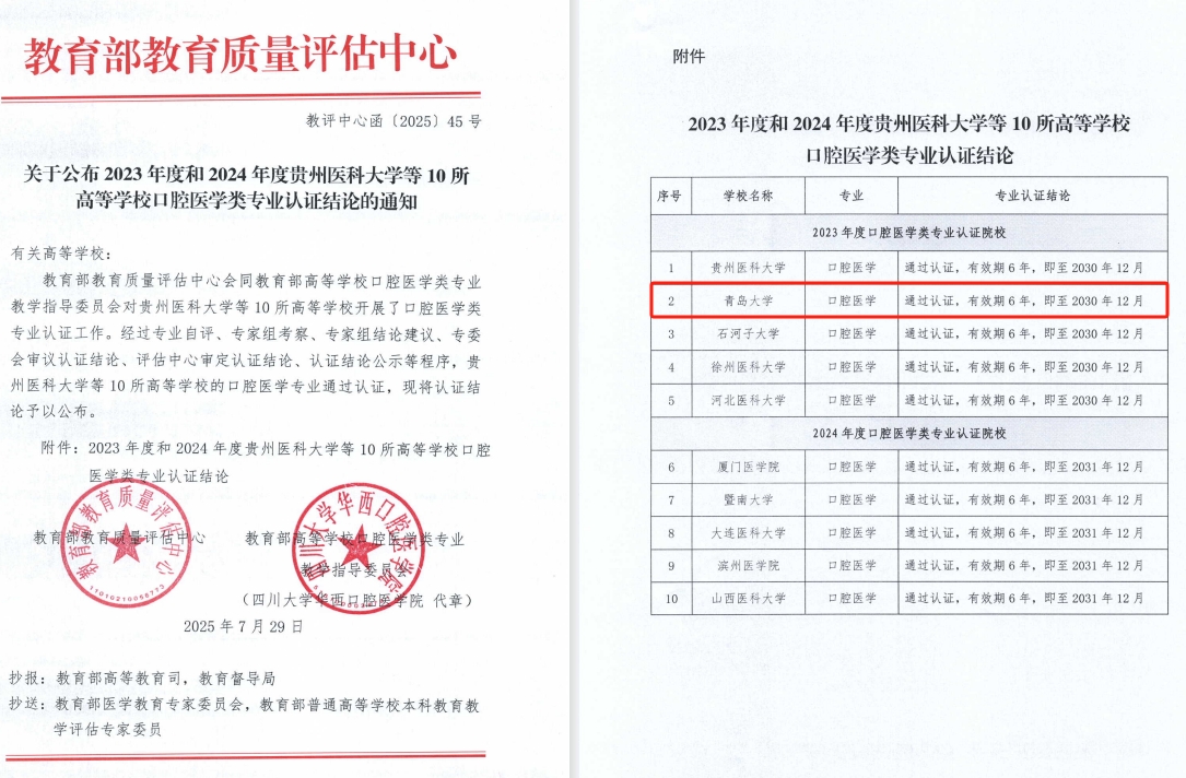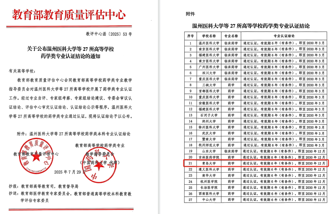 此前,金年金临床医学、护理学专业已相继通过教育部专业认证。随着口腔医学、药学专业获得认证,学校在医学教育领域逐步形成了“标准引领—认证驱动—持续改进”的质量保障良性生态,为金年金字招牌诚信至上医学教育的整体协同发展和内涵提升奠定了坚实基础。未来,学校将继续以专业建设为抓手,持续深化医学教育教学改革,紧密对接区域卫生健康事业发展需求,充分发挥综合性大学多学科交叉融合优势,大力推进医学与工科、理科、信息科学、人文社科等领域的深度融合,着力构建“医学+”复合型人才培养新范式,不断提升医学教育质量与创新能力,为健康山东和健康中国建设贡献更具特色、更高水平的青大医学力量。