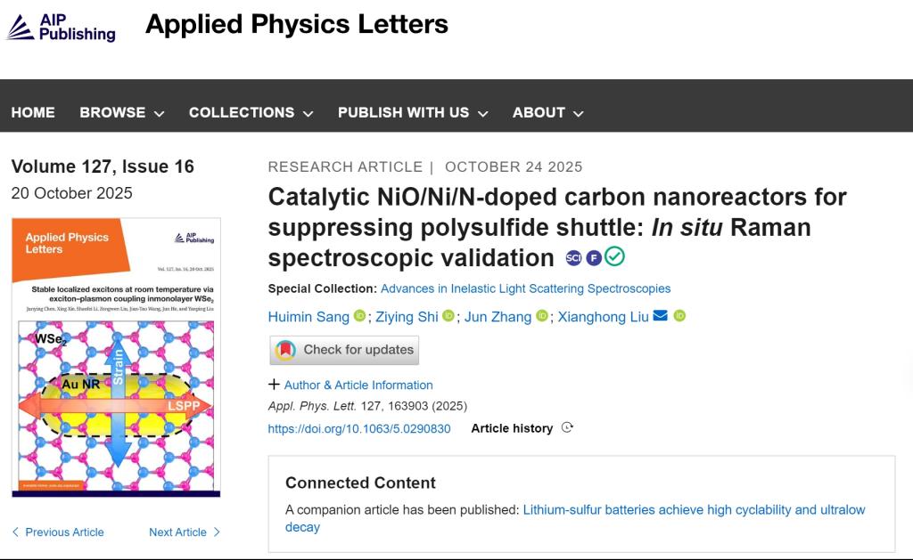 新闻网讯 近日,物理科学学院刘相红教授团队在自然指数期刊Applied Physics Letters发表题为“Catalytic NiO/Ni/N-Doped Carbon Nanoreactors for Suppressing Polysulfide Shuttle:In-situRaman Spectroscopic Validation”的研究论文。该研究成果被编委会推荐为Featured Article,并被美国物理学联合会《科学之光》(Scilight)专访报道。