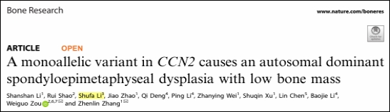 新闻网讯 青大附院内分泌与代谢性疾病科平度病区李树法教授于2024年10月在国际权威学术期刊 Bone Research(影响因子 15.0)发表题为“A monoallelic variant in CCN2 causes an autosomal dominant spondyloepimetaphyseal dysplasia with low bone mass” 的研究论文。该研究首次发现CCN2基因单等位基因变异可导致一种常染色体显性椎-骺-干骺端发育不良(SEMD),CCN2为新发致病基因,该病患者儿童期可出现摇摆步态、关节活动受限、下肢相对较短的矮身材,部分在青年期即出现类似骨关节炎的关节退变,成年期合并低骨量/骨质疏松,填补了 CCN2 缺陷相关人类表型长期空白。近日,该研究成果正式被“在线人类孟德尔遗传数据库(OMIM)”收录,论文前三位作者 Li Shanshan、Shao Rui 、Li Shufa(李树法)的姓氏被用于该疾病的诊断分型命名即“Li-Shao-Li型脊柱骨干骺端发育不良(Spondyloepimetaphyseal dysplasia, Li-Shao-Li type)”。人类医学史上以中国人姓名命名疾病不多,这一命名充分肯定了中国学者在遗传性骨骼发育不良分型领域的原创性贡献,也提升了我国在该研究方向上的国际话语权。