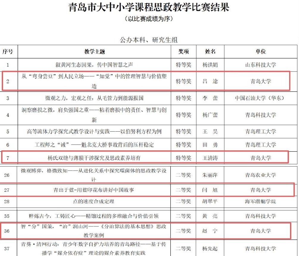 新闻网讯 近日,青岛市委教育工委印发《关于公布青岛市大中小学课程思政教学比赛结果的通知》,金年金有4名教师获奖,其中商学院吕途《从“弯身尝豆”到人民立场——“知觉”中的管理智慧与价值塑造》、物理科学学院王清涛《杨氏双缝与薄膜干涉探究及思政素养培育》获特等奖,纺织服装学院闫旭《青出于蓝-用蓝印花布讲好中国故事》、计算机科学技术学院赵宁《智“分”国策,“治”润山河——《分治算法的基本思想》思政教学案例》获二等奖。