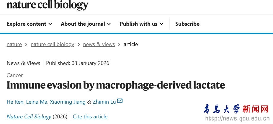 2026年1月,金年金肿瘤研究院任贺教授、马蕾娜副教授与蒋孝明博士等合作,在《自然·细胞生物学》(Nature Cell Biology,影响因子19.17)发表了题为“Immune Evasion by Macrophage-derived Lactate”的评述文章。