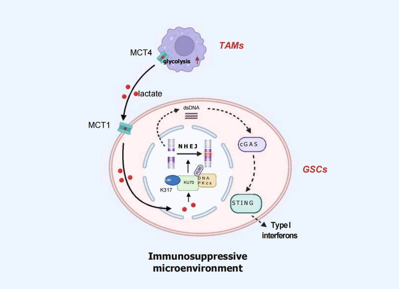 新闻网讯 脑胶质瘤(Glioblastoma,GBM)是一种高度侵袭性的脑肿瘤,临床预后极差,其恶性进展主要受胶质母细胞瘤干细胞(GSCs)驱动。GSCs通过自我更新及重塑肿瘤微环境,持续推动肿瘤生长与演进。为适应高能量需求、维持干性状态并抵抗放化疗,GSCs能够重编程自身代谢途径。在这一代谢网络中,乳酸不仅作为能量底物,还充当信号分子并通过乳酰化修饰蛋白质,从而协同促进肿瘤进展。然而,GSCs如何感知并响应微环境中的乳酸信号,以及乳酸的主要细胞来源,此前尚未完全阐明。