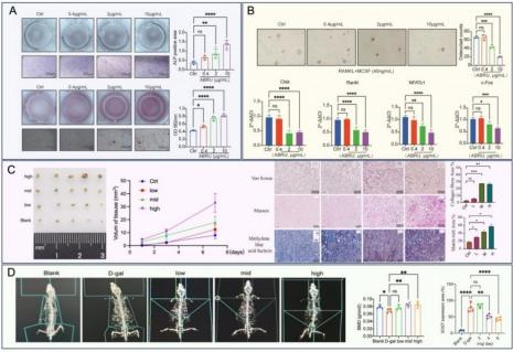 团队研究发现,ABRU犹如精准“智能钥匙”,能靶向抑制骨硬化蛋白SOST这一被全球公认为骨修复“关键开关”的成药靶点,可以实现“促进成骨、抑制破骨”的双向精准调节,可以将成骨细胞活性提升40%以上,同时抑制破骨细胞分化35%。实现了“让骨形成快于丢失”的调控效果,为骨骼关节疾患提供了“既强又韧”的干预范式。