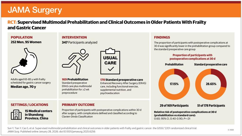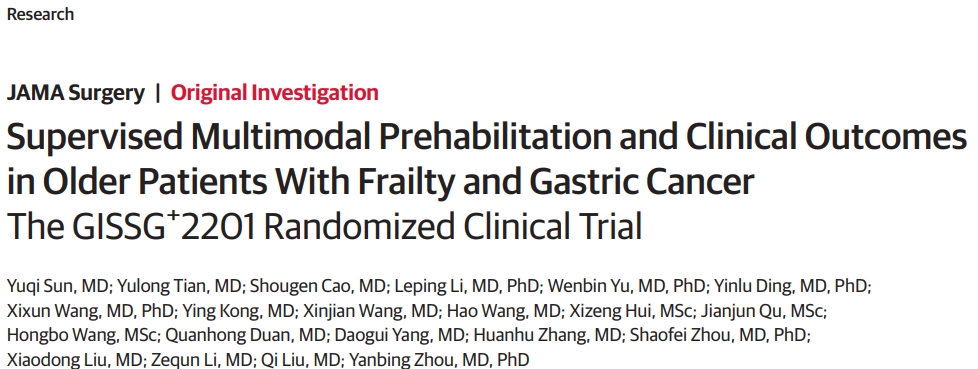 新闻网讯 近日,青大附院胃肠外科周岩冰教授作为主要研究者(Leading PI),牵头开展的研究者发起(IIT)多中心随机对照试验(RCT)研究成果,正式发表于外科学领域国际顶级期刊《美国医学会杂志·外科学》(JAMA Surgery)。该研究论著标题为“Supervised Multimodal Prehabilitation and Clinical Outcomes in Older Patients With Frailty and Gastric Cancer: The GISSG+2201 Randomized Clinical Trial”(《居家监督下多模式预康复对虚弱老年胃癌患者临床结局的影响:GISSG+2201随机临床试验》)。金年金2025届博士毕业生、急诊外科孙钰淇医师为第一作者,作为博士课题全程参加此项研究。周岩冰教授为唯一通讯作者。此项高水平研究成果的发表标志着青大附院在老年胃癌患者围手术期管理领域的研究达到国际领先水平,取得了具有里程碑意义的重要进展。