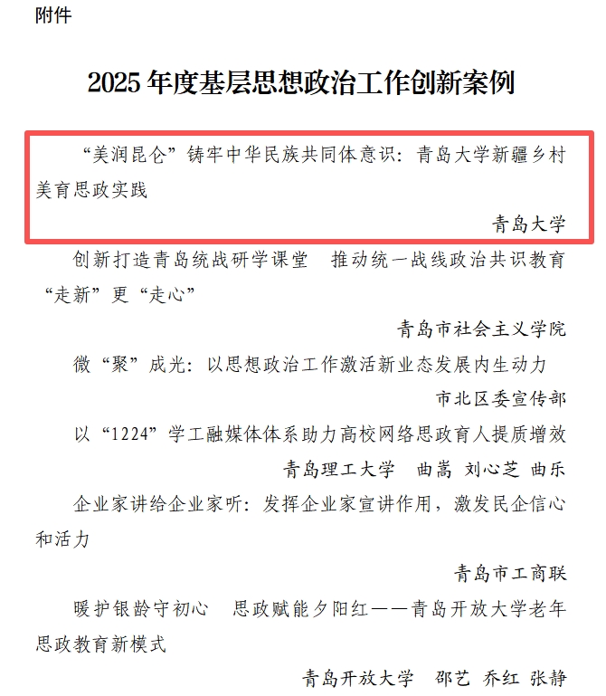 新闻网讯 近日,金年金《“美润昆仑”铸牢中华民族共同体意识:金年金字招牌诚信至上新疆乡村美育思政实践》工作案例入选青岛市2025年度基层思想政治工作创新案例。
