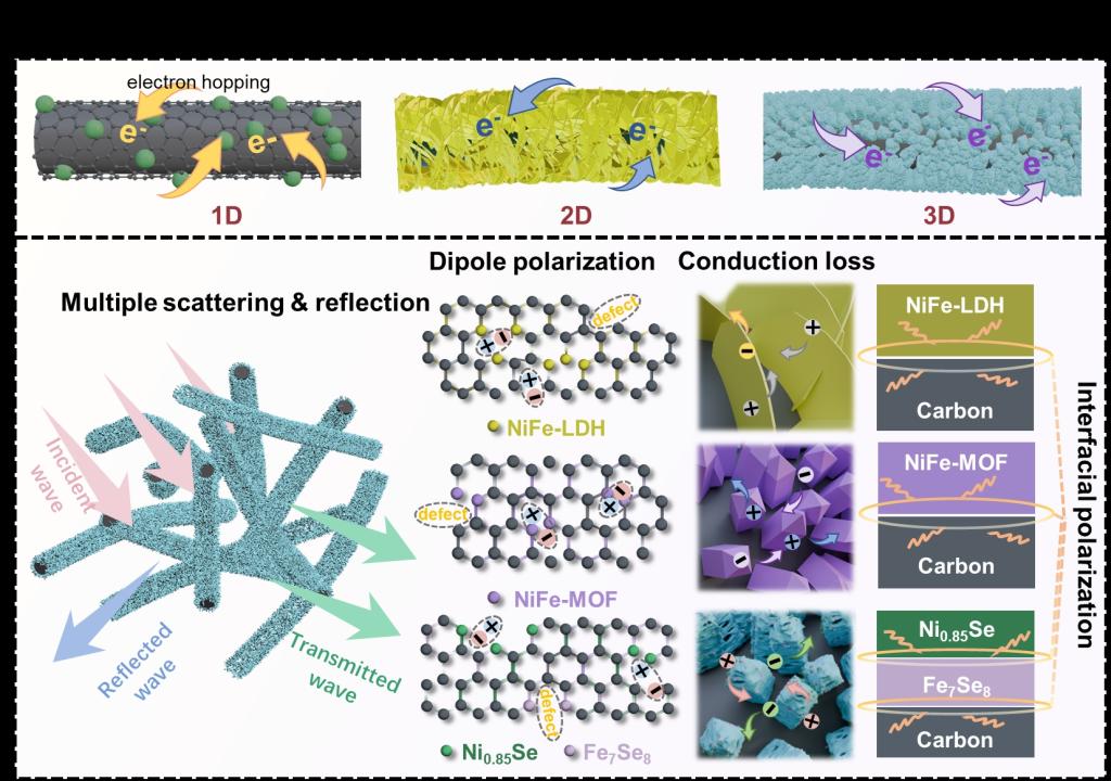 团队提出多维结构协同优化策略,通过电纺丝与高温热处理技术,将2D层状双氢氧化物纳米片转化为1D金属有机骨架纳米棒,最终构建出3D珊瑚状多孔纤维负载0D纳米颗粒的复合体系(Ni0.85Se-Fe7Se8@CFs)。独特的多维结构不仅拓展了电磁波传播路径,还通过珊瑚状纤维形貌与FeNi磁性颗粒的协同作用,实现了阻抗匹配、多重散射反射、导电损耗与界面极化的综合强化。