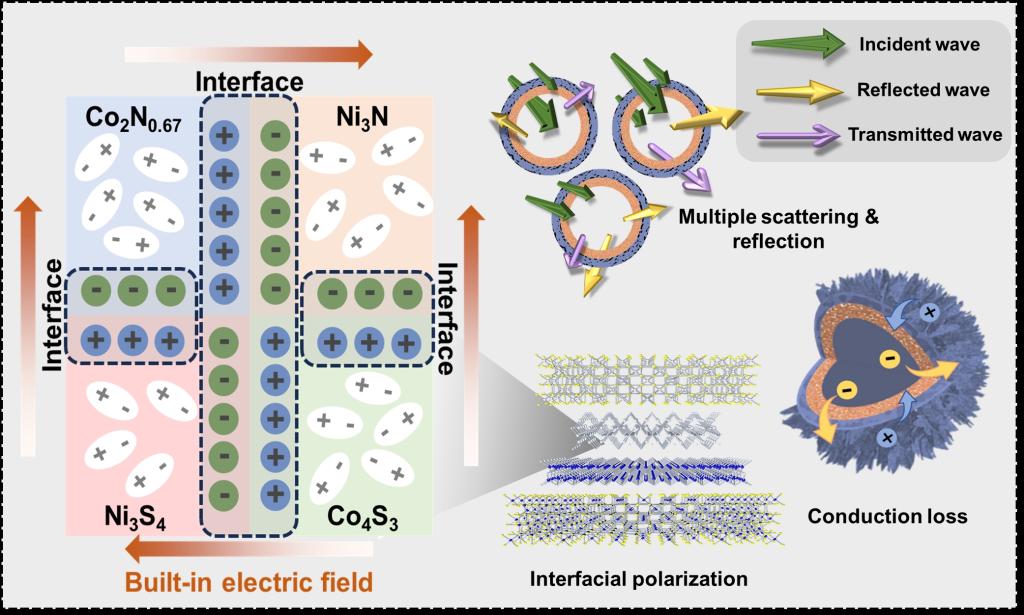 针对单一组分材料极化弛豫效率低的瓶颈,团队通过硫化、氮化等多步工艺制备了Ni3S4@Co4S3/Ni3N@Co2N0.67(NC-S/NC-N)复合材料,创新性构建了Type-II异质结调控的BIEF模型。研究通过XRD精修与DFT计算,揭示了内建电场对界面电荷分布的调控机制:其不仅能增强界面极化强度,加速载流子传输以提升导电损耗,还可通过调制Ni/Co磁性组分的自旋极化优化磁损耗。