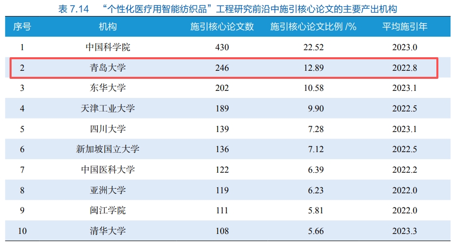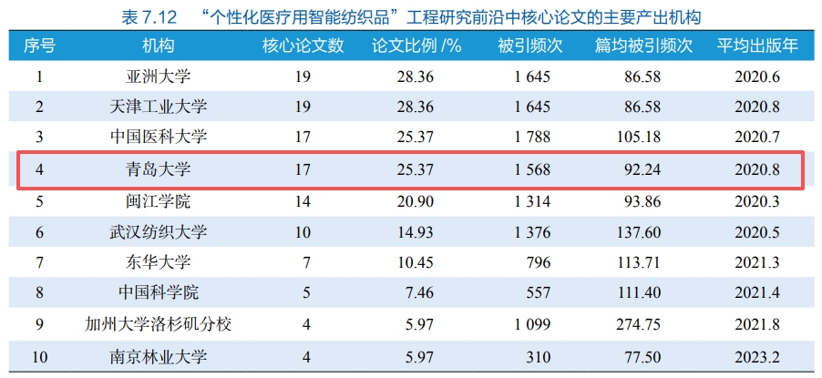 报告指出,个性化医疗用智能纺织品是纺织工程、微电子、信息科学与生物医学交叉融合的前沿领域,入选环境与轻纺工程领域Top10工程研究前沿,成为纺织科技跨界融合的标志性成果。