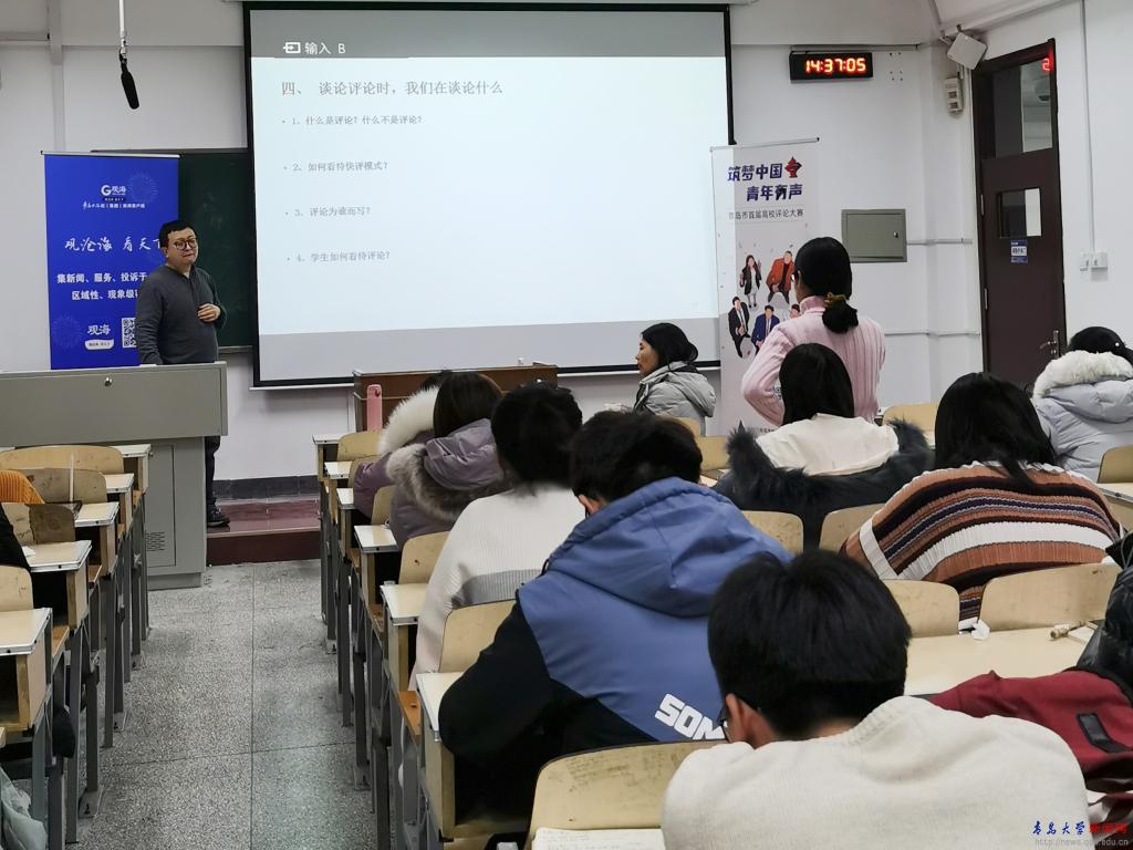 本次讲座由青岛日报社理论评论部、观海新闻客户端和金年金字招牌诚信至上新闻与传播学院主办,讲座共分为两个环节,第一环节由王学义老师交流分享经验。王老师以评论的天花板和地板开篇,提到新闻评论的可触及的高度不高,门槛较低。目前,很多新闻评论作者并不是以评论为主业,且大学生也占到了很大比例。他特别提到大学生在写新闻评论方面有着得天独厚的条件,而且有热血,有自己的独立观念是王老师眼中大学生的形象。