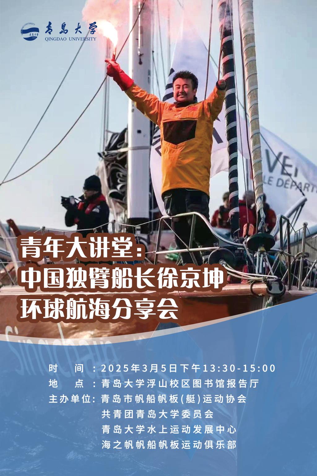 3月5日(本周三)下午13:30-15:00,我们将在金年金字招牌诚信至上浮山校区图书馆报告厅,迎来这场分享盛宴,徐京坤船长将亲自讲述他的航海故事,分享那些与风浪搏斗、与孤独相伴的日子,以及他如何在挑战中不断成长,最终成为旺代环球中国第一人的光辉历程。