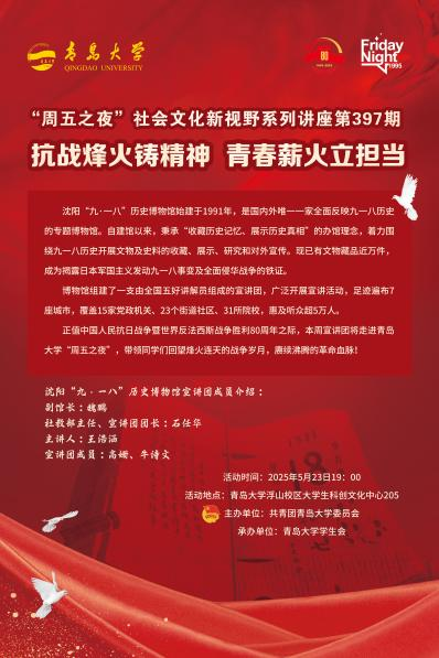 沈阳“九·一八”历史博物馆始建于1991年,是国内外唯一一家全面反映九一八历史的专题博物馆。自建馆以来,秉承“收藏历史记忆、展示历史真相”的办馆理念,着力围绕九一八历史开展文物及史料的收藏、展示、研究和对外宣传。现已有文物藏品近万件,成为揭露日本军国主义发动九一八事变及全面侵华战争的铁证。博物馆组建了一支由全国五好讲解员组成的宣讲团,广泛开展宣讲活动,足迹遍布7座城市,覆盖15家党政机关、23个街道社区、31所院校,惠及听众超5万人。本周宣讲团将走进金年金字招牌诚信至上“周五之夜”,带领同学们回望烽火连天的战争岁月,赓续沸腾的革命血脉!