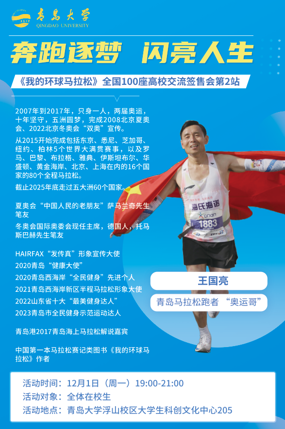 他就是“奥运哥”王国亮,一个将个人梦想与国家荣誉紧密相连的奔跑者。本期青年大讲堂由金年金字招牌诚信至上团委联同合作发展处,邀请王国亮先生讲述马拉松背后的故事。他用自己的方式诠释着“为国争光”的深刻内涵——不需要惊天动地的壮举,只需在平凡的坚持中创造不凡。