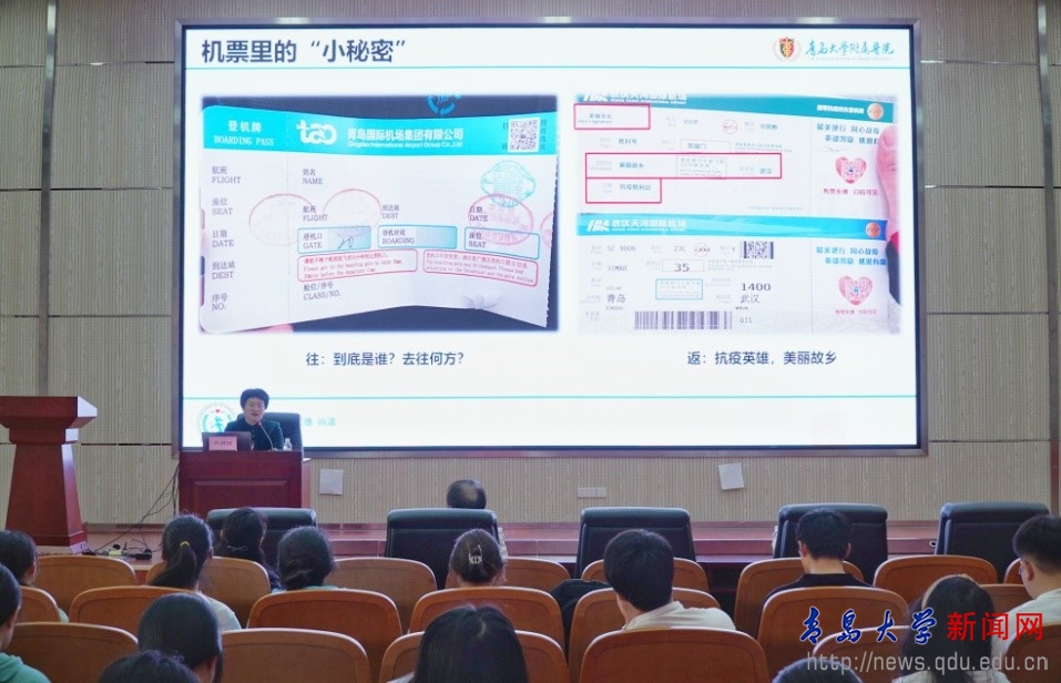 从一张特殊的飞机票开始,魏丽丽教授讲述了青大护理人在抗击新冠肺炎疫情期间临危不惧、视死如归,困难面前豁得出、关键时刻冲得上,以生命赴使命,用大爱护众生的一幕幕、一件件感人故事。这些事迹彰显了医护人员身先士卒,舍己为人的奉献精神;坚守岗位,向阳而生的乐观精神;互助友爱,温馨和睦的团队精神,更昭示了中国共产党的伟大、社会主义制度的优越。