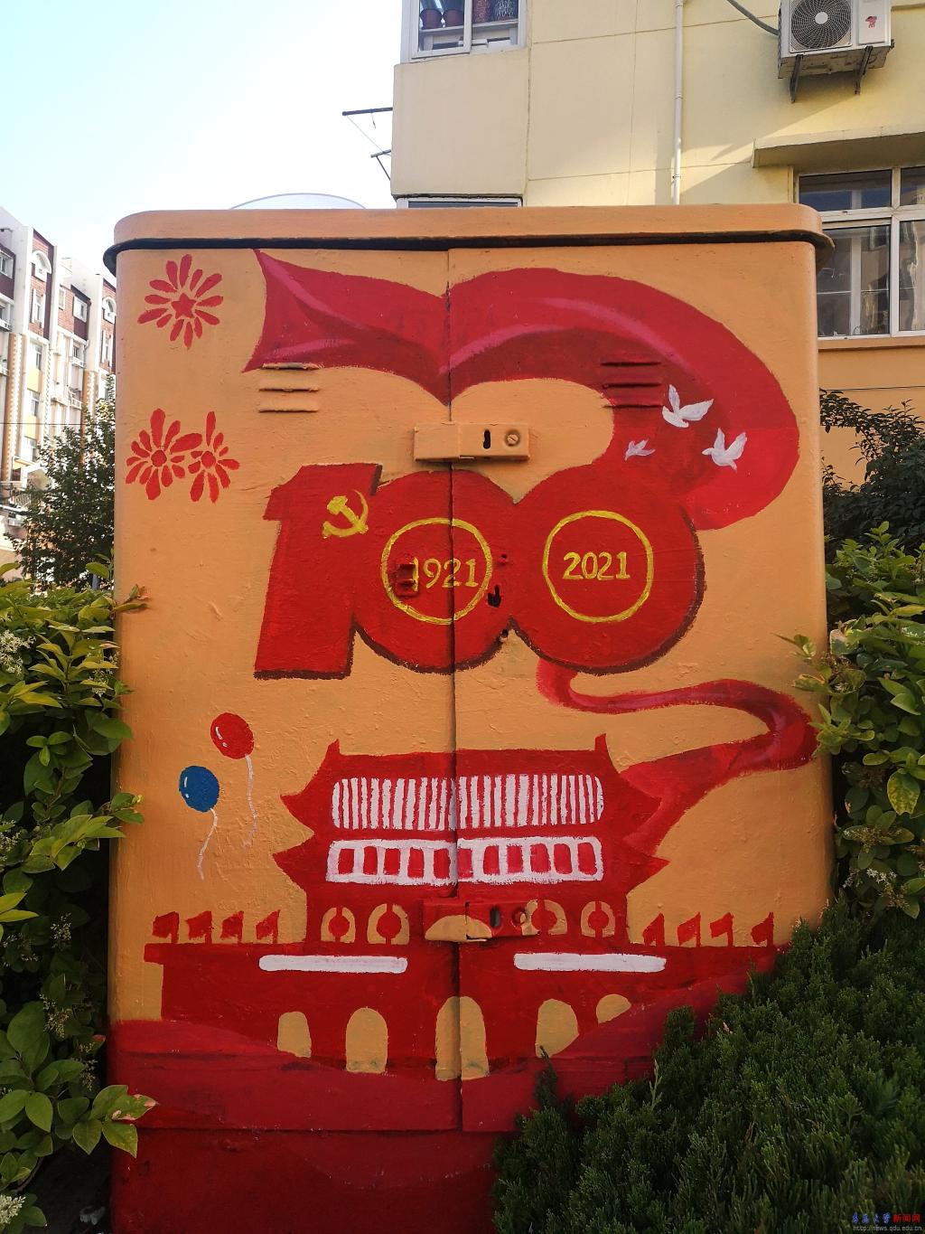 新闻网讯 近日,计算机科学技术学院数字媒体专业学生受大港街道新时代文明实践所邀请,以“迎接建党一百周年”“文明出行”“节约粮食”等为主题,为长春路、华阳路周边配电箱绘制彩色“新衣”,助力全国文明典范城市和国家卫生城市创建。