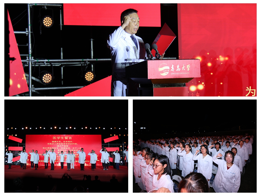 李永春领誓,全体新生起立共同宣读《医学生誓词》。“健康所系,性命相托”、“为祖国医药卫生事业的发展和人类身心健康奋斗终生”,嘹亮而坚定的声音在体育场上空回响。从此,他们有了一个共同的名字——青大医学人。