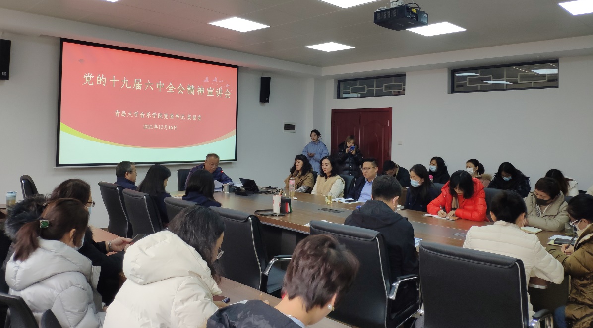新闻网讯 12月16日下午,音乐学院党委在学院资料室举行党的十九届六中全会精神宣讲会,学习宣传贯彻党的十九届六中全会精神。音乐学院党委书记姜世安进行了宣讲,学院全体教工党员、学生党员代表和入党积极分子代表参加了宣讲会。