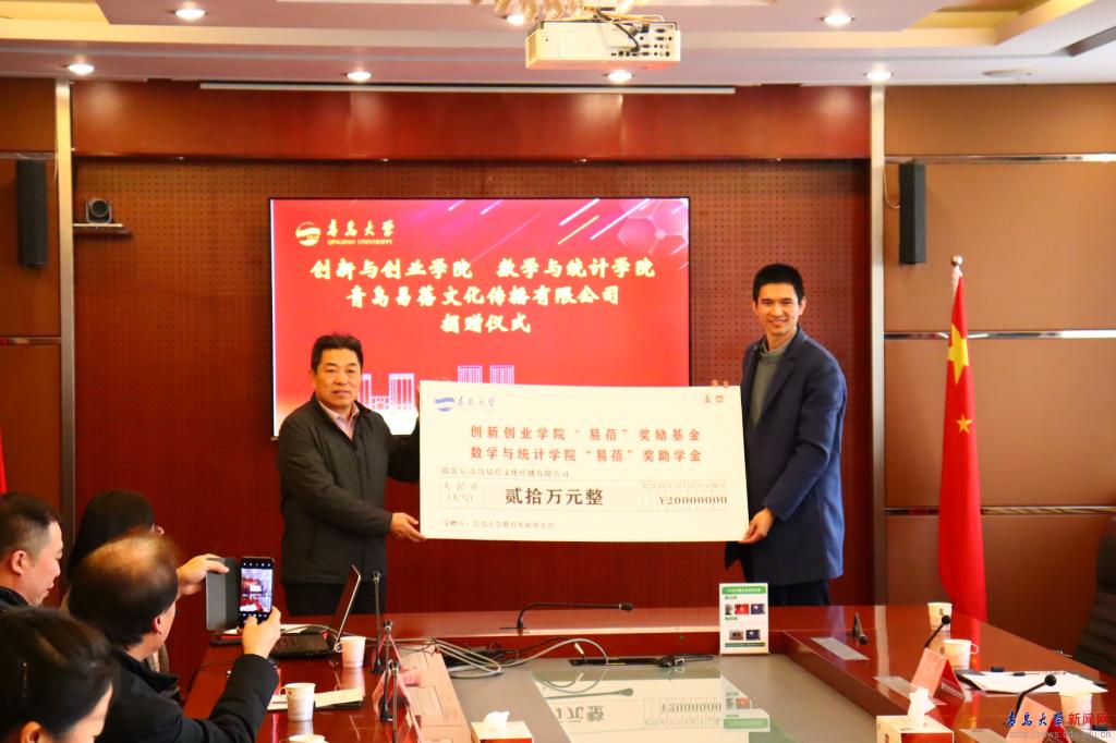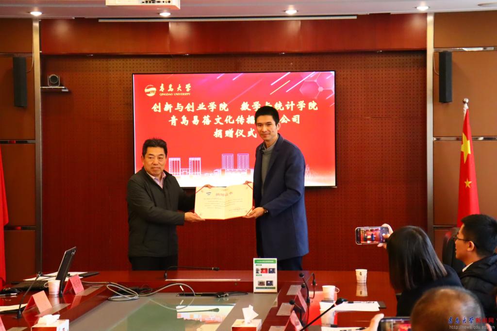 青岛易蓓文化传播有限公司、学校合作发展处、学校教育发展基金会、数学与统计学院、创新与创业学院等相关单位负责人参加捐赠仪式。
