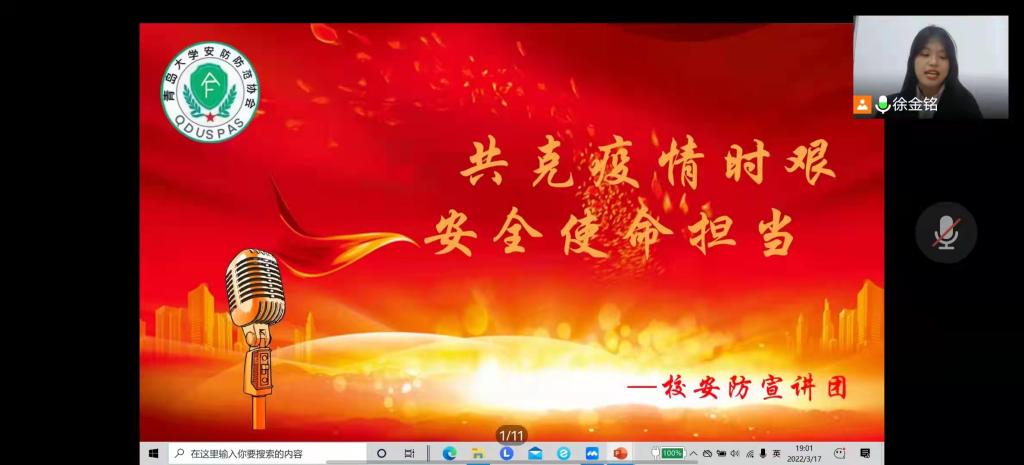 宣讲团以 “共克疫情时艰,安全使命担当”系列宣讲及交流会在腾讯会议平台顺利开展。宣讲团成员分别对护理学院、师范学院、材料学院部分学生作了《纯净校园、无毒最美》、《战疫之中学防护,时代青年勇担当》、《文明上网由我先行,携手共书文明校园》、《校园反诈不能停,你我一道筑盾牌》的宣讲,宣讲从人类命运共同体的角度,讲解当代大学生在疫情之下如何担当时代责任,以实际行动积极学习安全知识,牢固树立安全意识,为学校安全稳定做出积极的努力。讲解中分享校园防疫知识、以国家采取的高效、及时、全面防控举措为例,生动讲解了中国力量、中国速度正是中国特色社会主义制度优势的具体体现。宣讲团成员还通过网络诈骗案例视频的播放,介绍了疫情期间频繁出现的诈骗类型,细心叮嘱学生们,疫情尚未结束,不法分子找准了 “见缝插针”的时机趁机诈骗,学生们通过线上普及疫情下最新的校园诈骗手段,进一步提升识骗、防骗本领,增强安全防范意识,保护自己和家人。每场线上宣讲活动增加了互动提问环节,气氛活跃,深受启发,达到了较好的宣传效果。