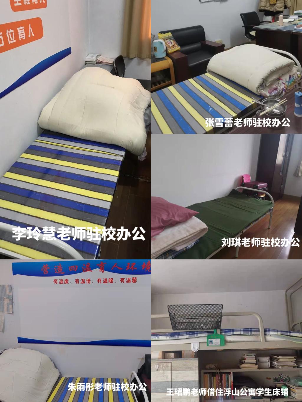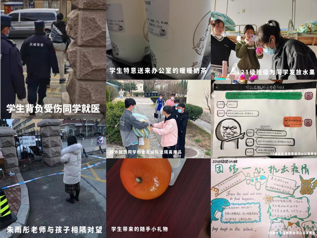 接到封校指令后,学院值守老师们安顿好孩子,备好行装,驻扎进校,每天吃住在办公室。王珺鹏老师更是临时受命成为浮山公寓的“副区长”,住在学生宿舍,成为学生的“定心丸”。