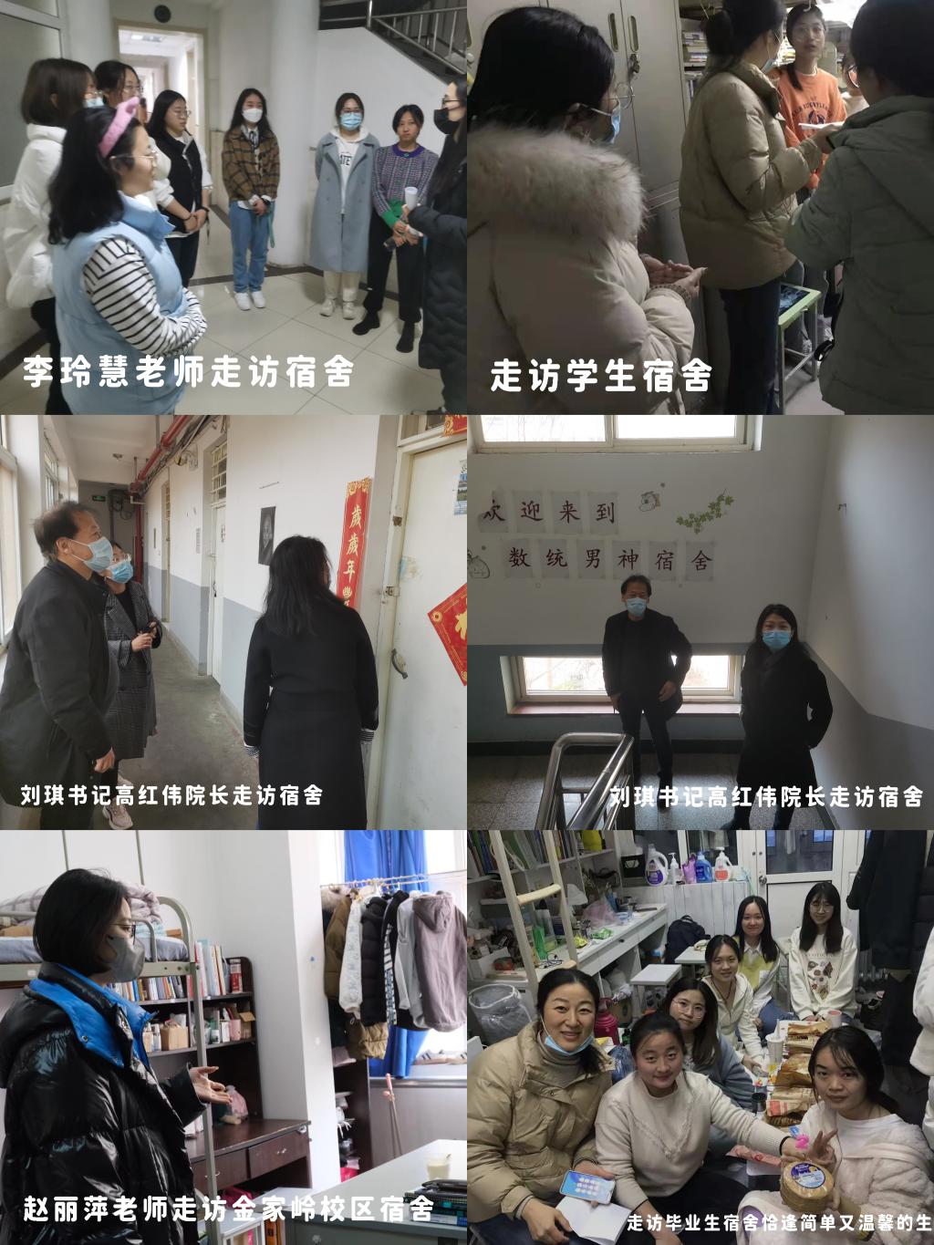 学院领导、辅导员深入学生宿舍,关心问候,亲切交谈,为学生送去抗疫的精神力量。编写发布学院学工人员抗疫工作明白纸、数统学子抗疫明白纸,传达了学校疫情防控规定,耐心细致叮嘱同学们戴好口罩,特殊时期不外卖不网购。走访毕业班学生宿舍时,与毕业班学生就学业、考研以及毕业论文进展进行重点交流,鼓励大家以良好心态迎接复试和求职面试。疫情当前,复试指导、就业指导,各场讲座,一切如常,没有放下。