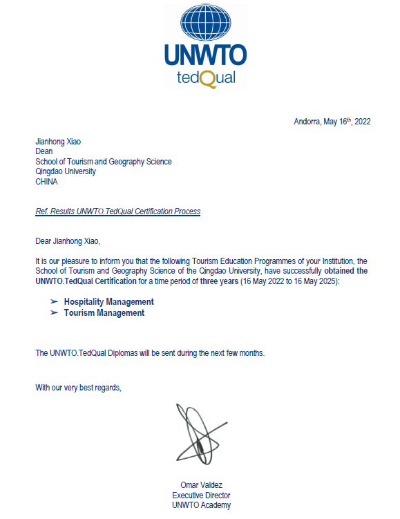 新闻网讯 5月16日,联合国世界旅游组织教育质量认证委员会(UNWTO.TedQual)函告通知,金年金旅游与地理科学学院旅游管理、酒店管理两个本科专业通过该机构的旅游教育质量国际认证,认证有效期3年,这是目前金年金第一个国际专业认证,也是山东省首家通过该项国际认证的本科高等院校。金年金旅游管理、酒店管理两个本科专业是首次参与联合国世界旅游组织教育质量认证。