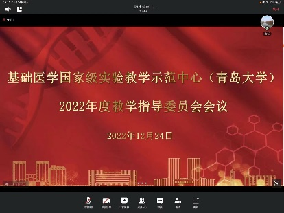 新闻网讯 12月24日,基础医学国家级实验教学示范中心(金年金字招牌诚信至上)2022年度教学指导委员会线上会议顺利召开。教务处副处长(主持工作)马泽刚,医学部副部长李冰,基础医学院党委书记丛红群、院长王建勋以及其他党政班子领导、各部门主任及实验中心全体人员参加了会议。来自国内其他兄弟院校、教学指导委员会各位专家受邀线上参会。会议由王建勋主持。