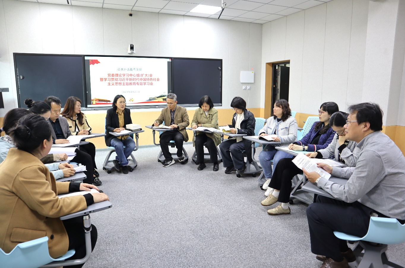 新闻网讯 4月27日下午,公共外语教育学院党委理论学习中心组(扩大)在睿思楼202会议室举行习近平新时代中国特色社会主义思想主题教育主题学习会。会议由院党委书记刘海荣主持,学院党政领导、骨干教师参加学习。