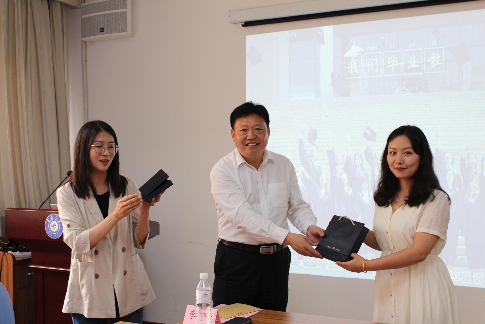 班会最后,英语(语言大数据)创新实验班学生代表李俣霏将凝结班级四年成长与对母校感恩之情的《致母校的一封信》交予母校,陈涛代表学校向同学们赠送了代表着青大文化和青大精神的文创产品。