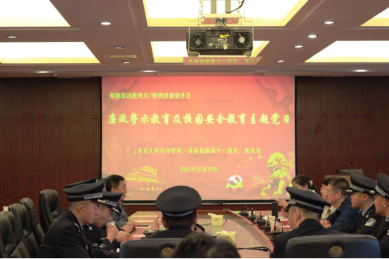 新闻网讯 为贯彻落实党的二十大精神,学习贯彻习近平新时代中国特色社会主义思想,促进优势互补、资源共享、双向赋能,10月19日,外语学院与青岛监狱共同开展主题党日活动,在廉政警示教育、校园防诈骗安全等多个方面深入交流与合作。此次活动旨在加强基层党建,相互学习借鉴,创新“党建+法制”新模式。青岛监狱第十一监区党支部书记曲波,教育改造处党支部书记刘恒吉,外语学院党委书记周伟、院长卞建华及其他领导班子成员、各系办中心主任(副主任)、研究生导师、全体辅导员、各支部书记、教师党员、学生党员代表共同参与了本次主题党日活动。
