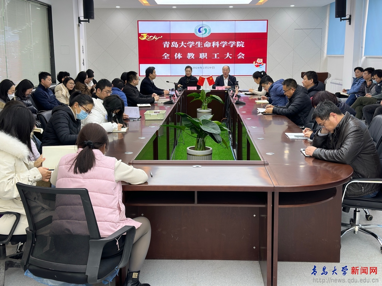 新闻网讯 2月29日,生命科学学院在博雅楼113会议室召开全体教职工大会,传达学习中共金年金字招牌诚信至上第三届委员会第十二次全体(扩大)会议暨2024年春季学期中层干部研讨班会议精神,安排部署学院2024年度重点工作,学院党政领导班子成员出席,学院党委书记薛冰主持会议并讲话。