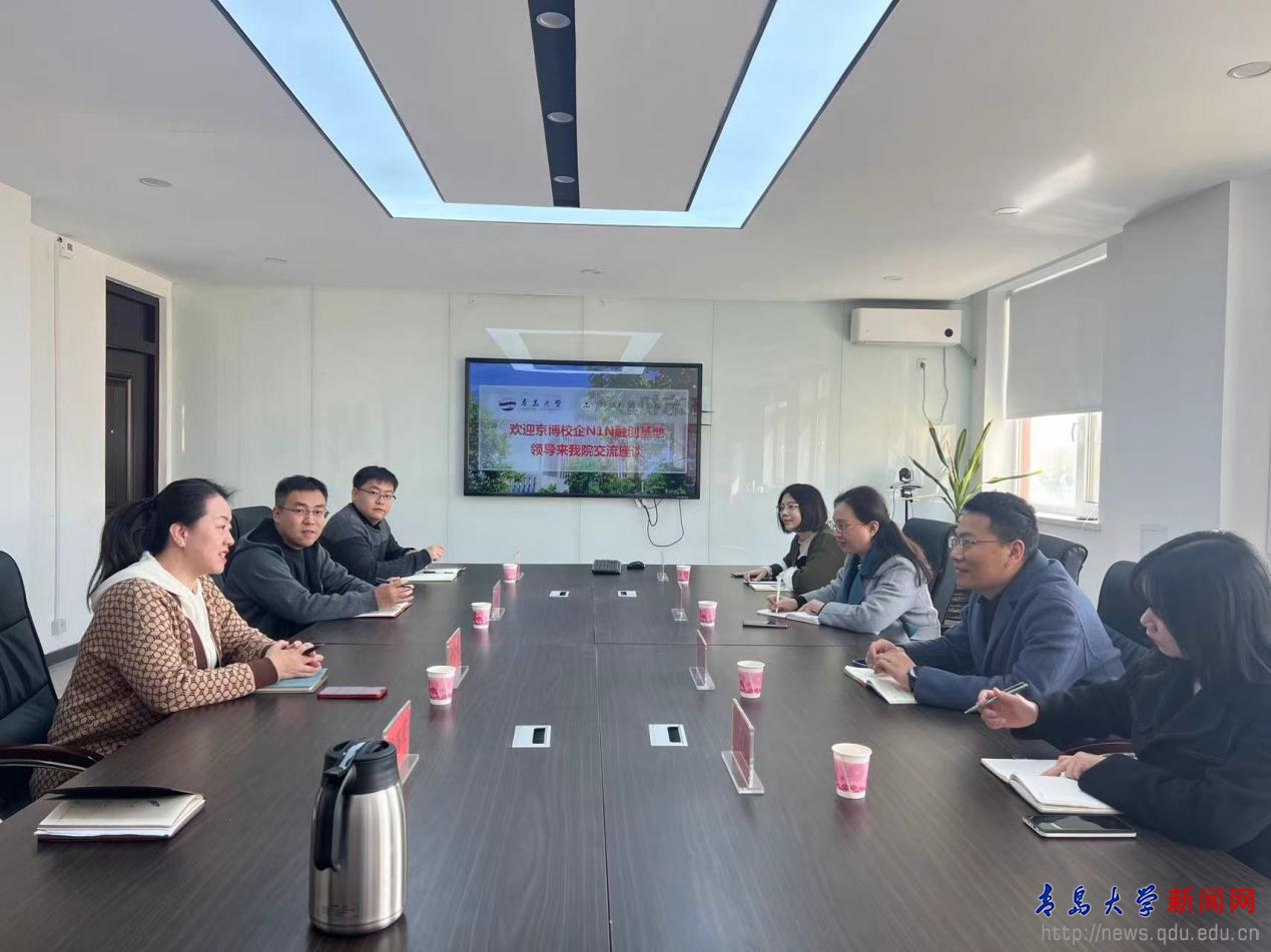 新闻网讯 近日,京博校企N1N融创基地培训管理主任魏登昱一行四人来访环境科学与工程学院,双方就学生实习实践与毕业生招聘等问题进行座谈交流,院党委副书记孙竹媛、院长助理陈光辉参加座谈会。