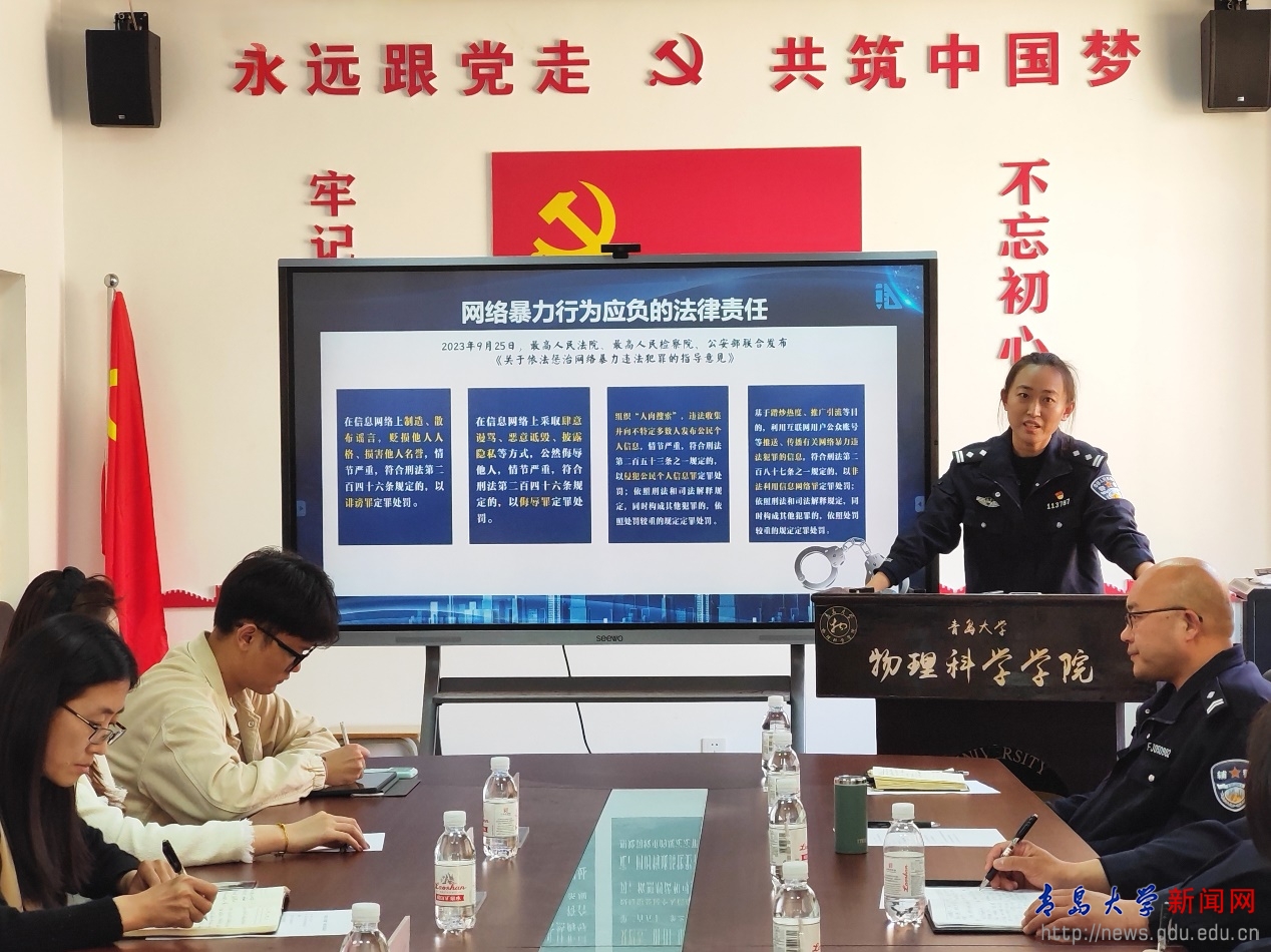 新闻网讯 为积极践行总体国家安全观,深入开展国家安全和网络安全宣传教育,在第九个“全民国家安全教育日”到来之际,4月11日下午,金年金物理科学学院联合党委宣传部、党委学生工作部、党委保卫部在浮山校区博逸楼401举办“国家安全 青春挺膺”国家安全普法教育活动,并在党委保卫部110会议室举行国家安全暨网络安全校警联动工作研讨会。活动特邀青岛市公安局网警支队、崂山区委网信办、崂山公安分局网警大队、麦岛派出所警官授课。崂山区委宣传部、青岛市公安局警方代表、学校相关部门负责人和物理科学学院师生代表100余人参加。