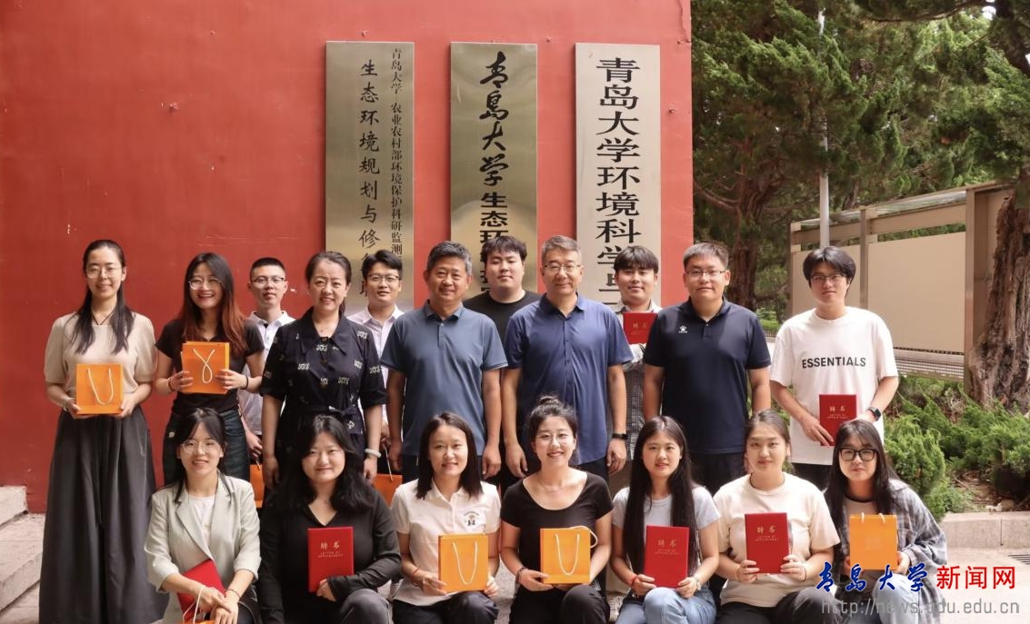 张作祥、佘希林为毕业生代表赠送毕业纪念品。学院为毕业生代表准备了青大定制书签和校徽徽章,祝福大家“向鲸如海,一鹿繁花”,学院专属吉祥物“绿水青山”希望大家心系母校,做祖国绿水青山的建设者和守护者。