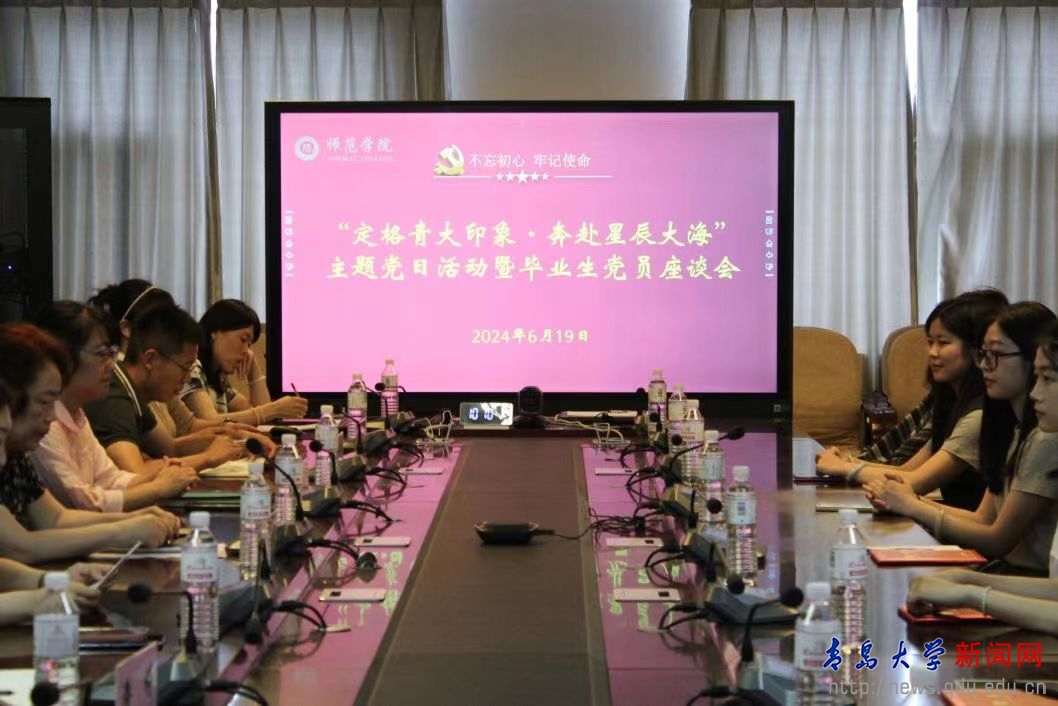新闻网讯 6月19日上午,师范学院于德润楼301会议室开展“定格青大印象•奔赴星辰大海”主题党日活动暨毕业生党员座谈会。院党委副书记夏锡梅、全体学工人员及2024届毕业生党员代表参加会议。学院本科生第一党支部书记张宁主持会议。