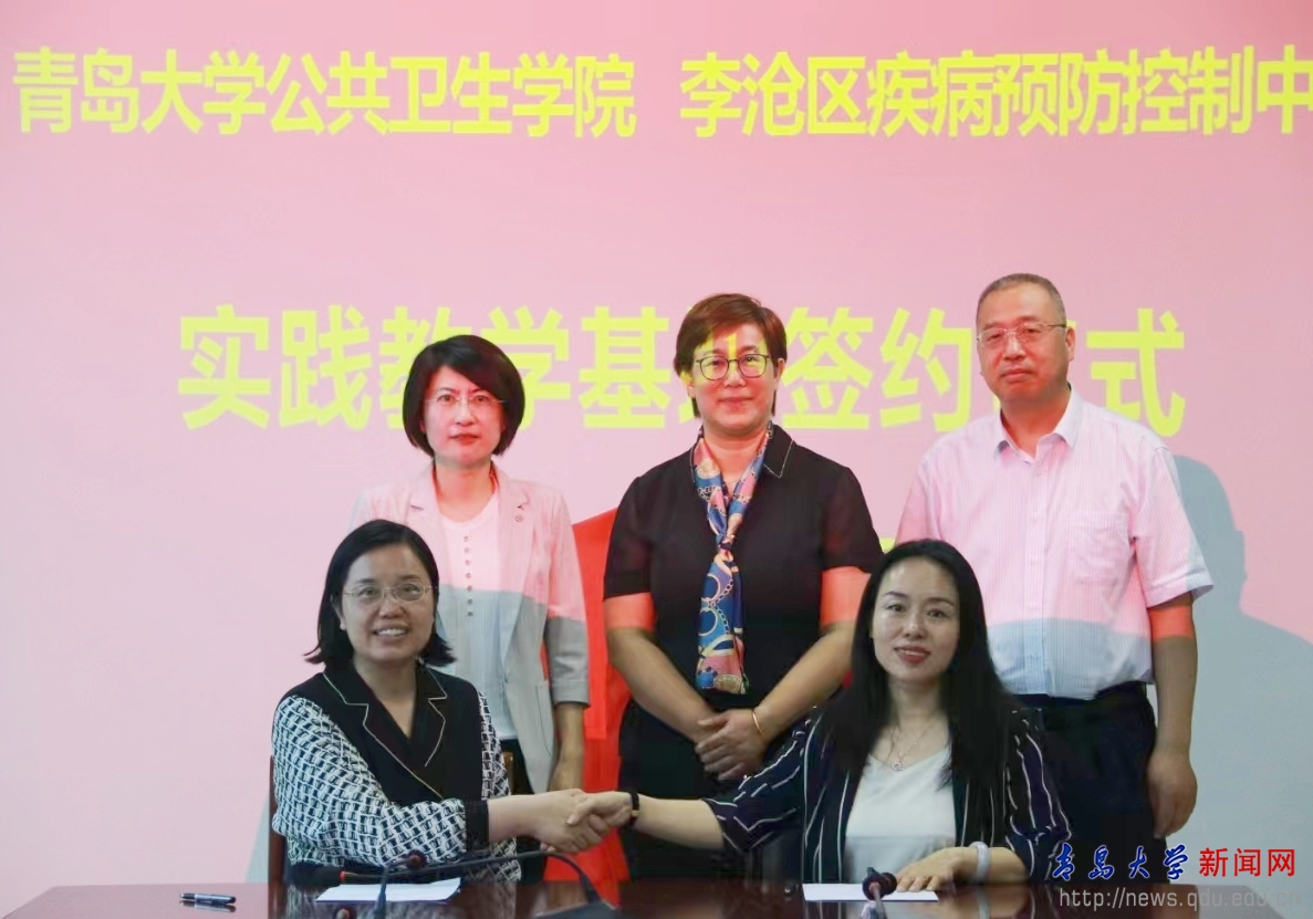 段海平、刘继章、沈晓丽共同为公共卫生学院李素云、魏潇然,李沧区疾病预防控制中心郑晓艳、董彩英颁发外聘专家和指导老师聘书。