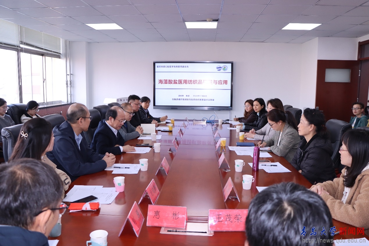 在学术交流环节,夏延致介绍了国家重点实验室的发展定位、科学研究及人才队伍建设情况,并以《海藻盐医用纺织品的研发与应用》为题作了专题报告。报告中,他详细阐述了基于海洋生物质(海藻)的纤维新材料基础研究、应用研究及产业化等情况,对未来海洋生物基纤维在医疗卫生领域的应用前景提出了思考和展望,并结合研究领域对下一步双方开展医工结合提出思路和期望。