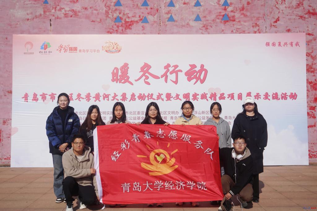 新闻网讯 11月23日,时值寒冬,位于浮山后新区的青岛市市北区新时代文明实践广场却是暖意融融。2024年“暖冬行动”暨市北区冬季黄河大集启动仪式拉开帷幕。爱心白菜进社区、冬衣捐赠、健康义诊、便民服务、文明风尚宣传……热心市民与志愿者们凝心聚力、爱心接力、温暖传递,让这个冬季不再寒冷。活动由市北区新时代文明实践中心、市北区委宣传部、市北区文明办等单位主办,青岛市微尘公益基金会、青岛笑姐志愿者公益发展中心、金年金经济学院等单位协办。经济学院经彩青春服务队志愿者参与活动志愿服务,辅导员周晓彤主持启动仪式。