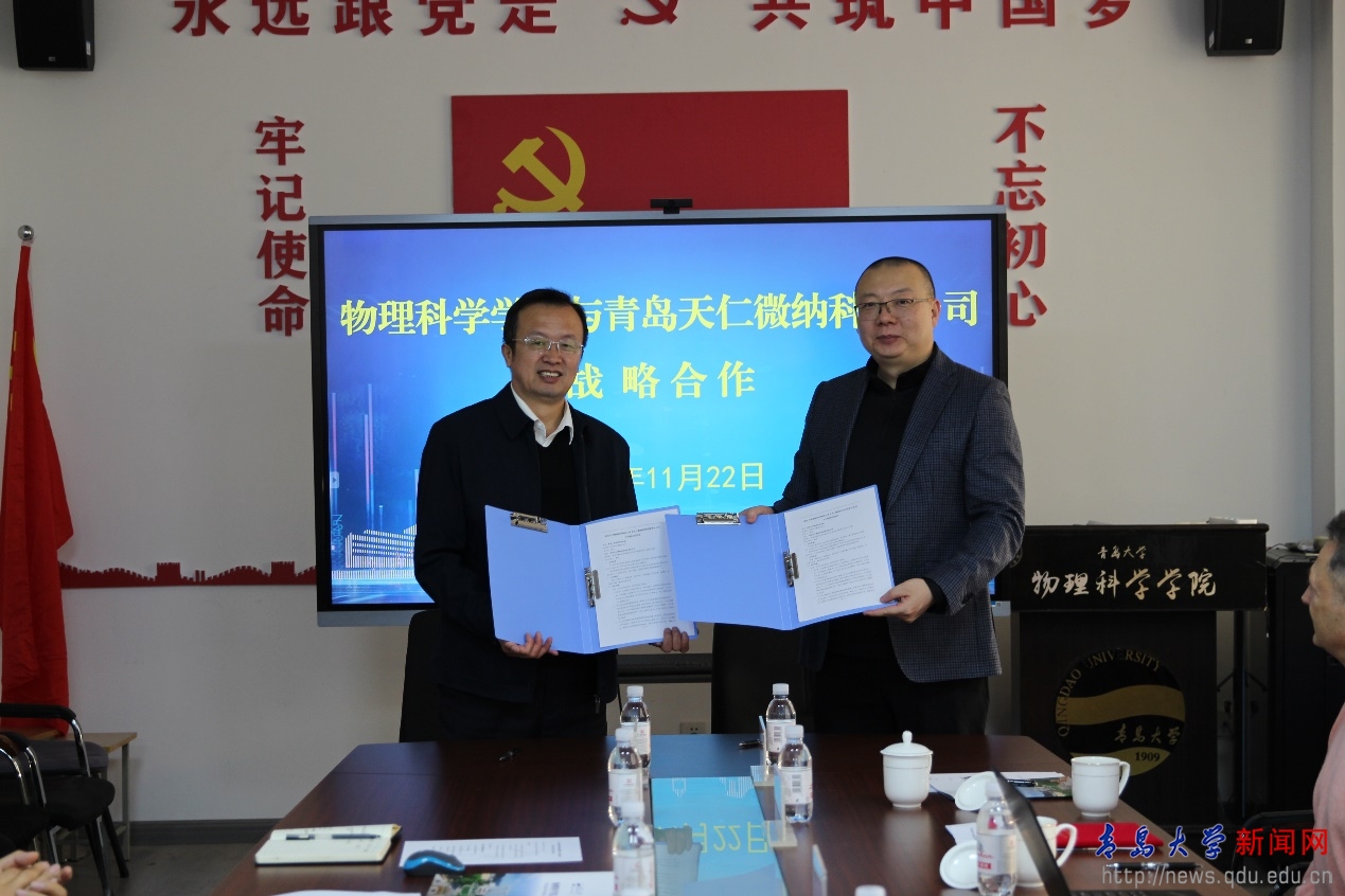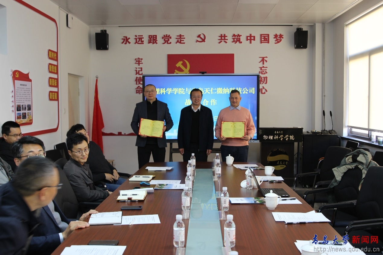 新闻网讯 11月22日上午,物理科学学院与青岛天仁微纳科技有限公司产学研合作签约暨客座教授聘任仪式在博逸楼401会议室举行。青岛天仁微纳科技有限公司董事长翼然博士、高级专家Massimo Tormen博士、监事张章、HR总监孙岩青、对外合作部董征、郝伦,物理科学学院党委书记郝伟、副院长张永成以及学院教师、学生代表参加会议,会议由物理科学学院副院长张军主持。