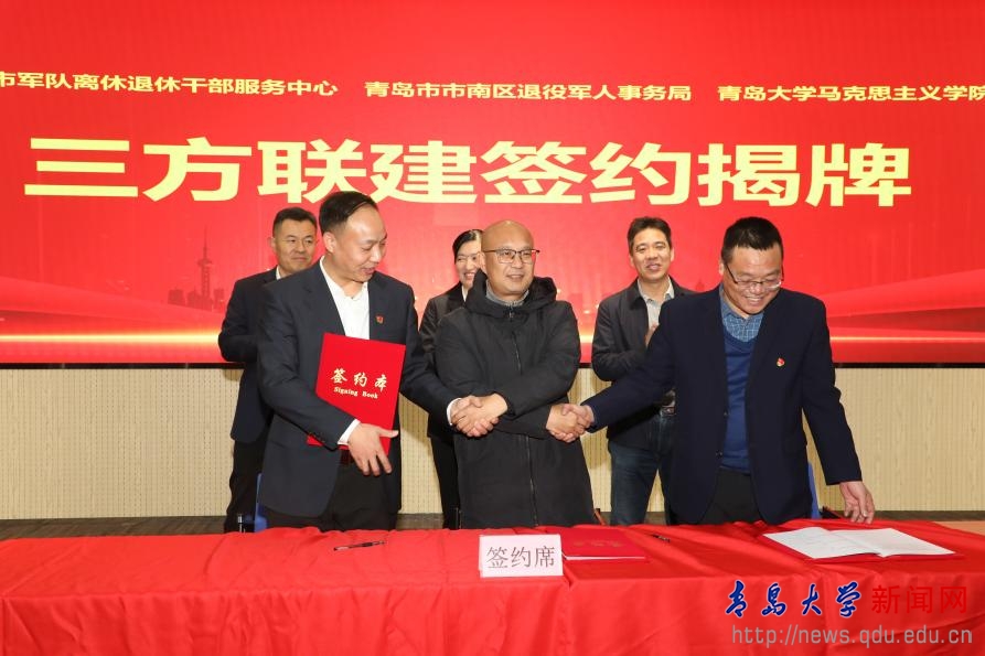 为深入学习习近平新时代中国特色社会主义思想,切实把习近平总书记关于“大思政课”及退役军人工作重要论述要求落到实处,充分发挥高校教育资源和退役军人事务部门红色资源优势,马克思主义学院(金年金字招牌诚信至上思政大课堂中心)分别在青岛市军队离休退休干部服务中心和青岛市市南区退役军人事务局建立“思政教育基地”和“‘青情向阳与军行’研习基地,用于学生社会实践和思政教育。在此基础上,为切实推动实现“互联共建、互助共赢”,三方本着自愿、平等、公平、诚信的原则,经友好协商,就以党建统领联建,在资源优化配置、提升服务效能等方面达成初步达成相关协议,以期推动退役军人事务工作与高校思政教育的深度融合,提升高校思政教育质量和水平,为退役军人提供更好服务。