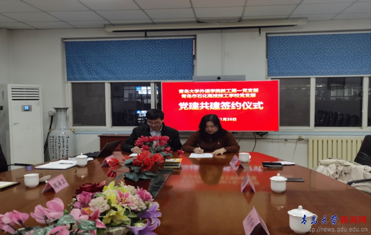 共建活动遵循“平等协作、共商共赢”的原则,双方党支部书记分别介绍了各自组织的基本情况,并就资源共享和交流、生活互融、优势互补和志愿服务、文化活动等方面达成了共识。外语学院教工第一党支部与青岛市石化高级技工学校党支部在共建签约仪式上正式达成合作。