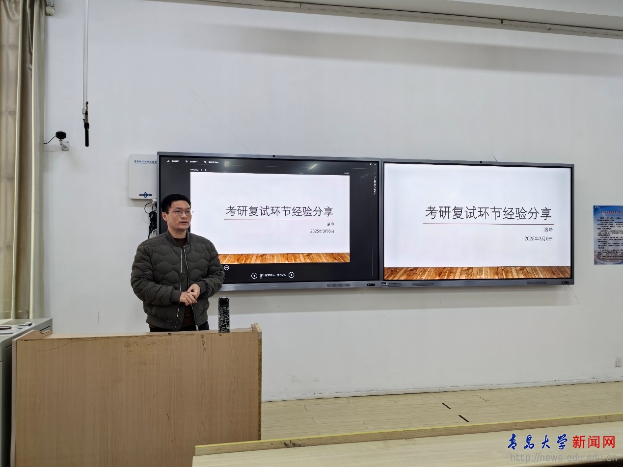 新闻网讯 近日,电子信息学院在敏思楼104教室举办2025届毕业生考研复试调剂经验交流会。2021级考研毕业生参加分享会。交流会由温峥教授主讲,院党委副书记刘孝群主持交流会。