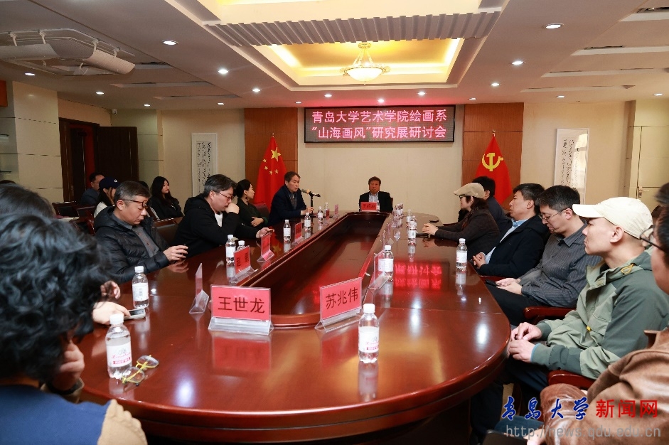绘画系主任亓文平主持研讨会,王绍波、窦凤至、王迪、昌隽如,王震宙、康颂美术文具用品宜兴有限公司李磊女士、艺术学院史论系教授黎晟等嘉宾以及参展画家先后发言,研讨会聚焦青岛本土文化资源转化、艺术语言创新及教学体系构建等问题,深入探讨“山海画风”的理论内涵与实践路径,旨在凝练青岛艺术标识,为城市文化品牌建设提供学术支撑。